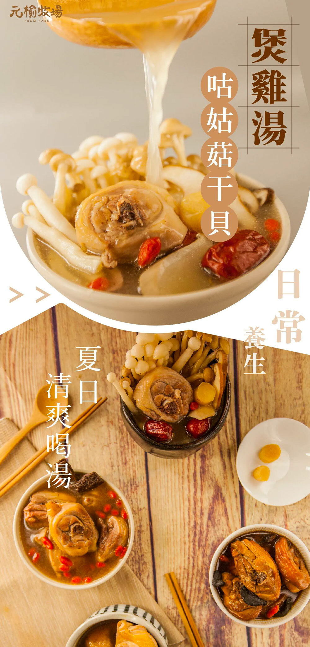 ・以土雞、多種鮮菇、紅棗及干貝文火慢燉,鮮甜回甘