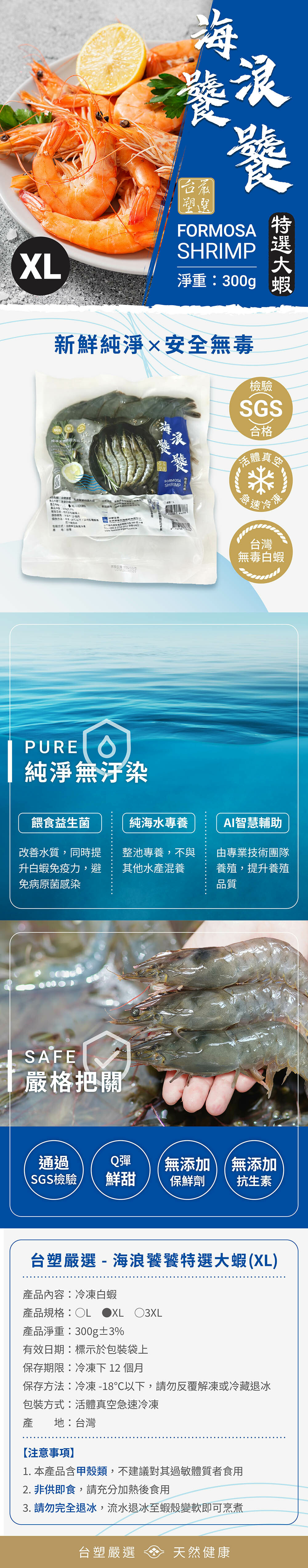 採用頂級優質益生菌及純海水室內/室外專養蝦群,無添加任何化學藥劑,活體真空急速冷凍,確保蝦肉Q彈鮮甜及無毒,SGS零檢出!