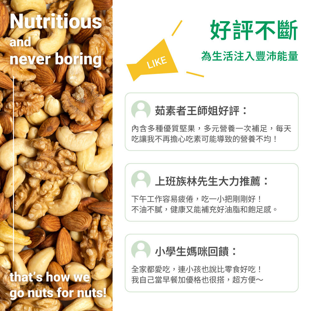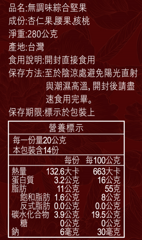 過敏原資訊:本產品含有堅果種子及其製品,不適合其過敏體質者食用。