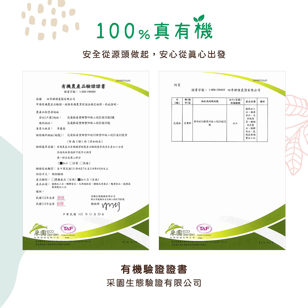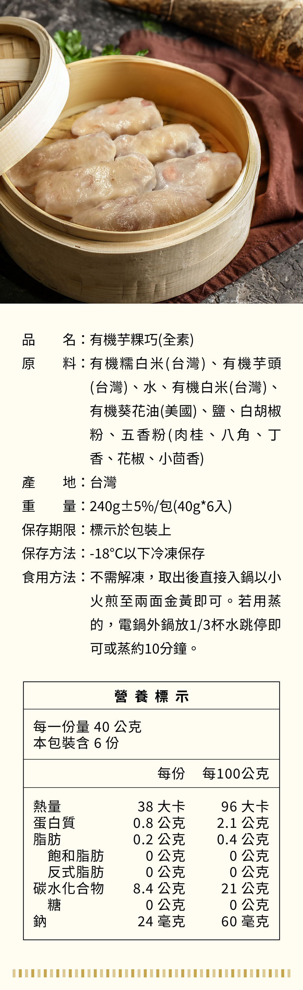 原料:有機糯白米(台灣)、有機芋頭(台灣)、水、有機白米(台灣)、有機葵花油(美國)、鹽、白胡椒粉、五香粉(肉桂、八角、丁香、花椒、小茴香)