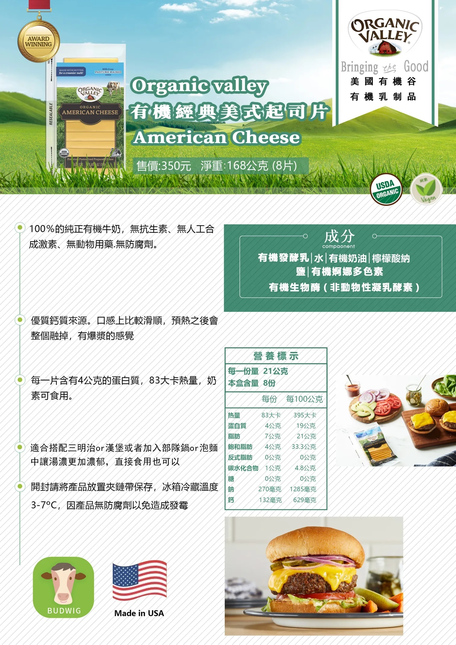 1經典美式起司片結合了切達及柯爾比的風味,猶如溫和的奶油帶點鹹味.低熔點的特性加熱後可延展,質地非常柔軟,口感較為溼潤,也非常適合直接食用.