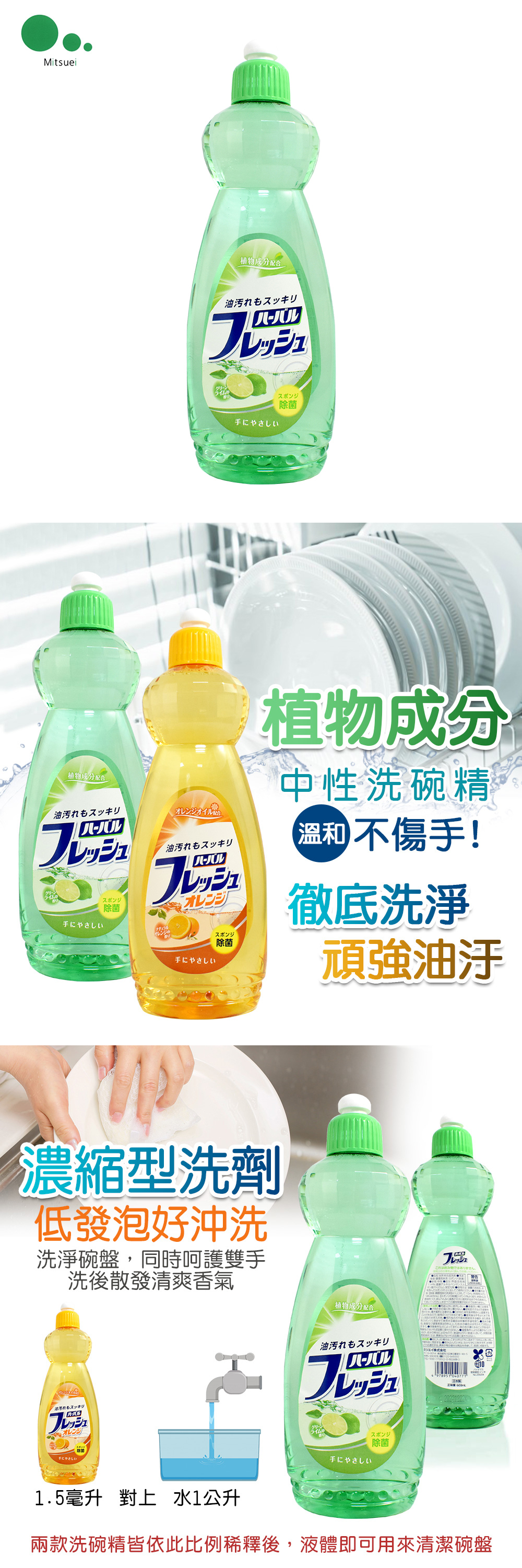 徹底洗淨碗盤上的油膩頑強污垢,易於沖淨不殘留 植物成分配方,讓您洗淨碗盤同時,也能溫和阿護您的雙手,洗後散發清爽檸檬香氣。