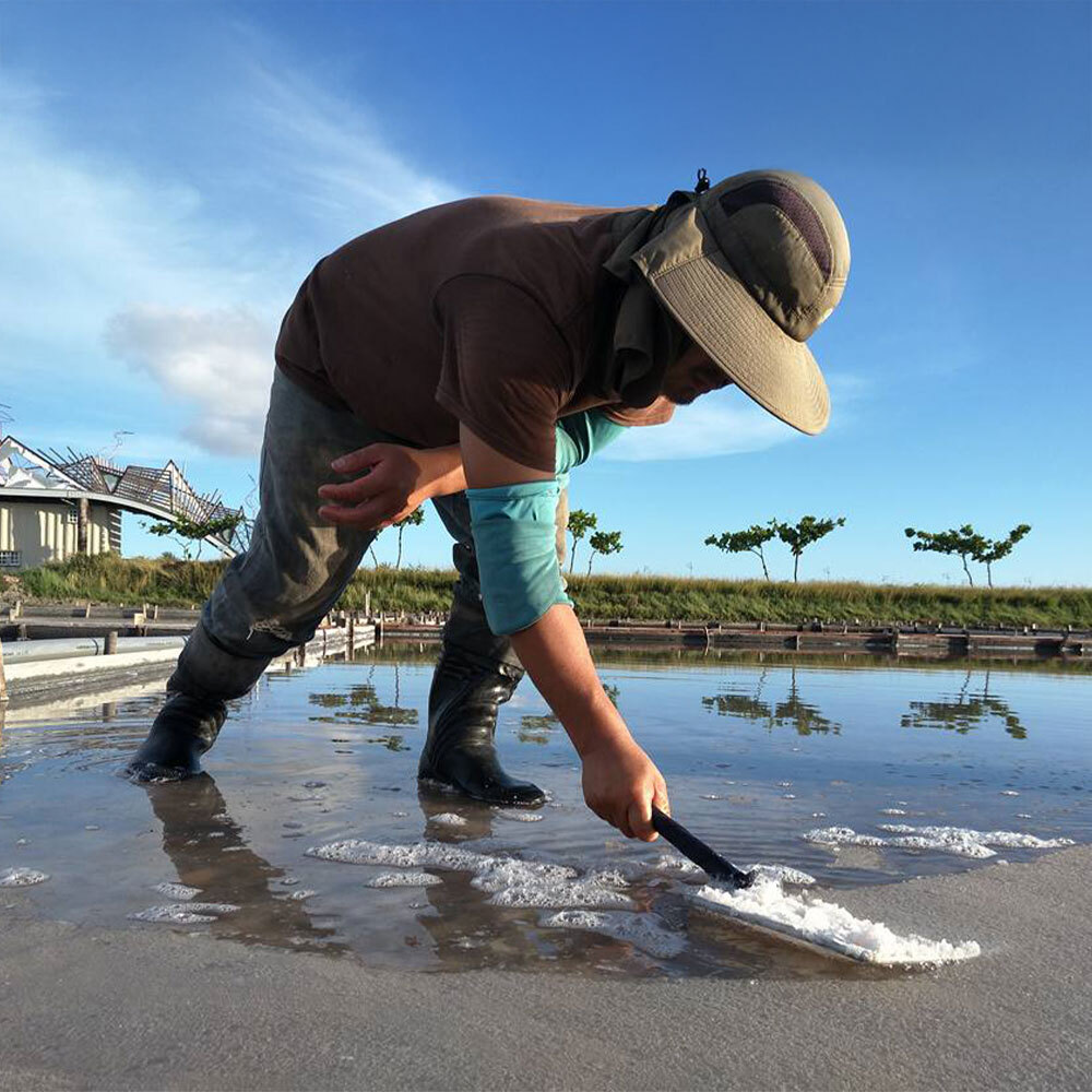 節氣春分之後天氣漸熱。適當風日條件下,結晶池鹵水表層因陽光直射而出現薄薄的鹽花結晶,鹽花與食材在口中咀嚼交匯,如雙人舞般,帶引出風味與美味。