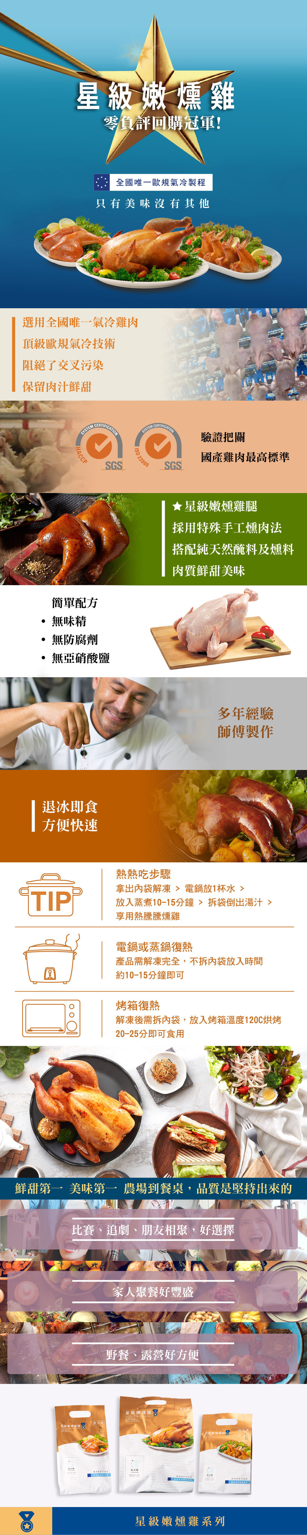 *選用全國唯一氣冷雞肉,保留肉汁鮮甜, 肉質鮮嫰不乾柴 *完全無添加防腐劑 亞硝酸鹽,採用特殊手工燻肉法 *搭配純天然醃料及燻料,成份單純無添加 *電鍋.烤箱加熱即食,快速又方便