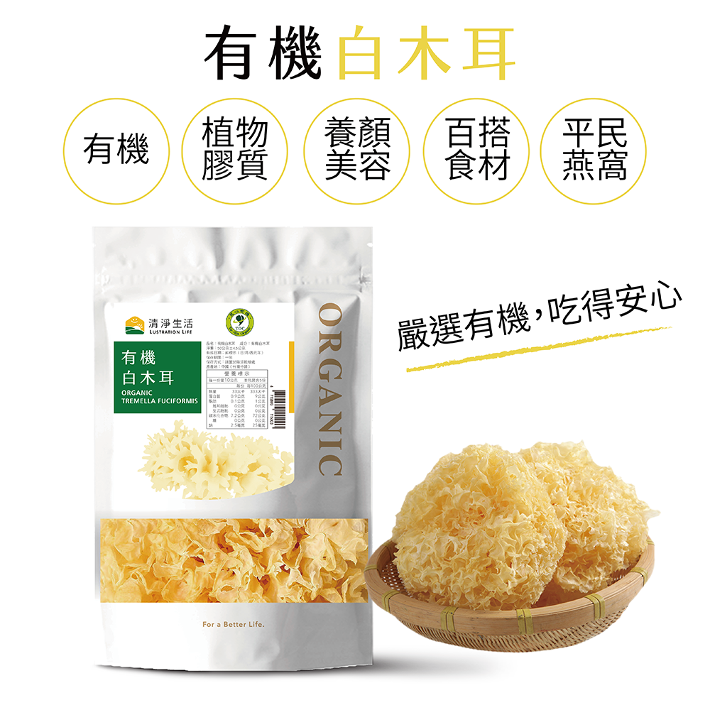 清淨生活的有機白木耳,有著淡淡獨特白木耳清香,是市售所沒有的,純天然沒有防腐劑及二氧化硫,並經SGS檢驗無農藥殘留及重金屬合法國家標示,為您的健康把關,敬請安心食用。現在有很多人主張用白木耳取代昂貴的燕窩來補充膠質保養身體,其料理時通常用以甜或鹹湯配料,例如冰糖蓮子、紅棗銀耳蓮子湯等,入口滑順,口感鮮脆,是自然又健康的美味佳餚。