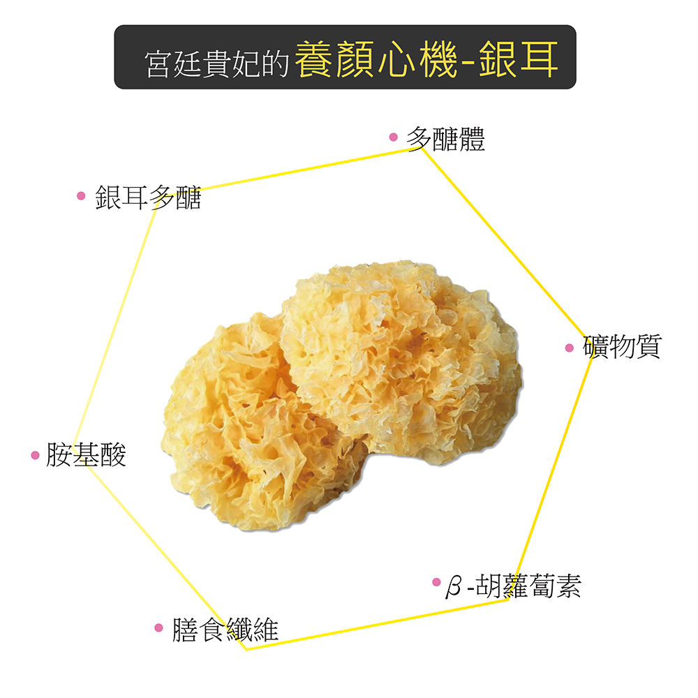 白木耳又稱銀耳,主要成份為植物性膠原蛋白質、礦物質、鈣質及豐富膳食纖維,可排便順暢,是很好的養顏美容聖品。尤其因富含膠質,口感滑潤,又低卡路里,愛美的女性可吃。