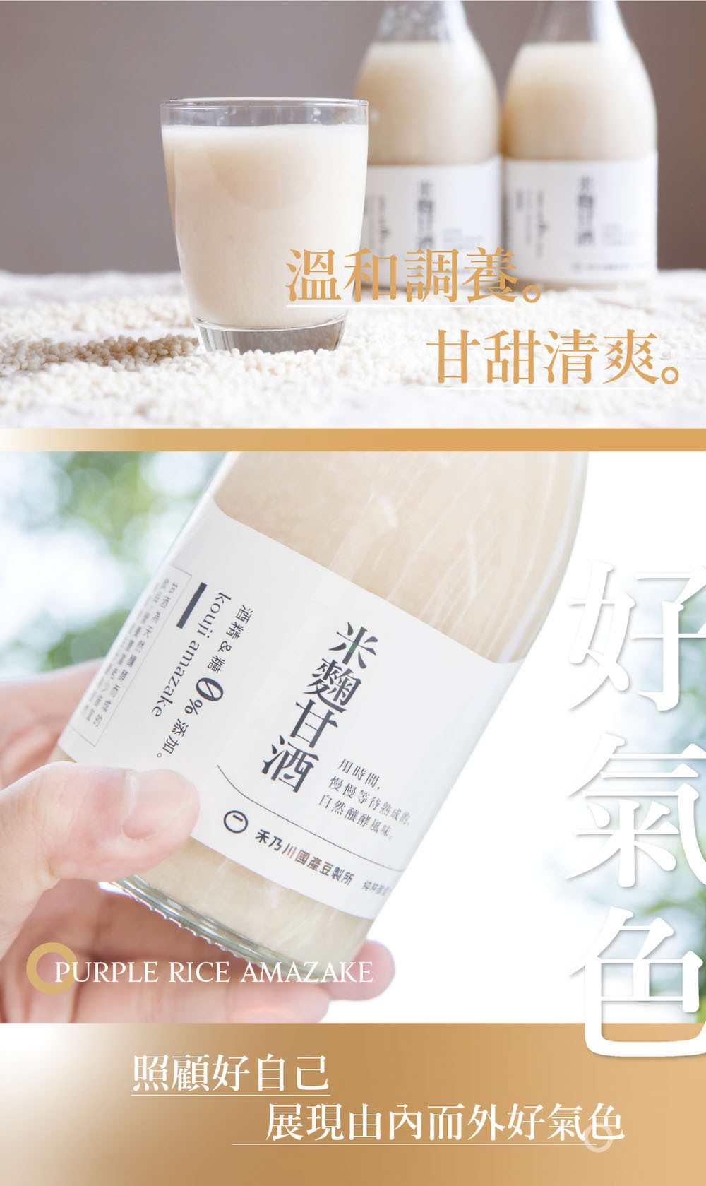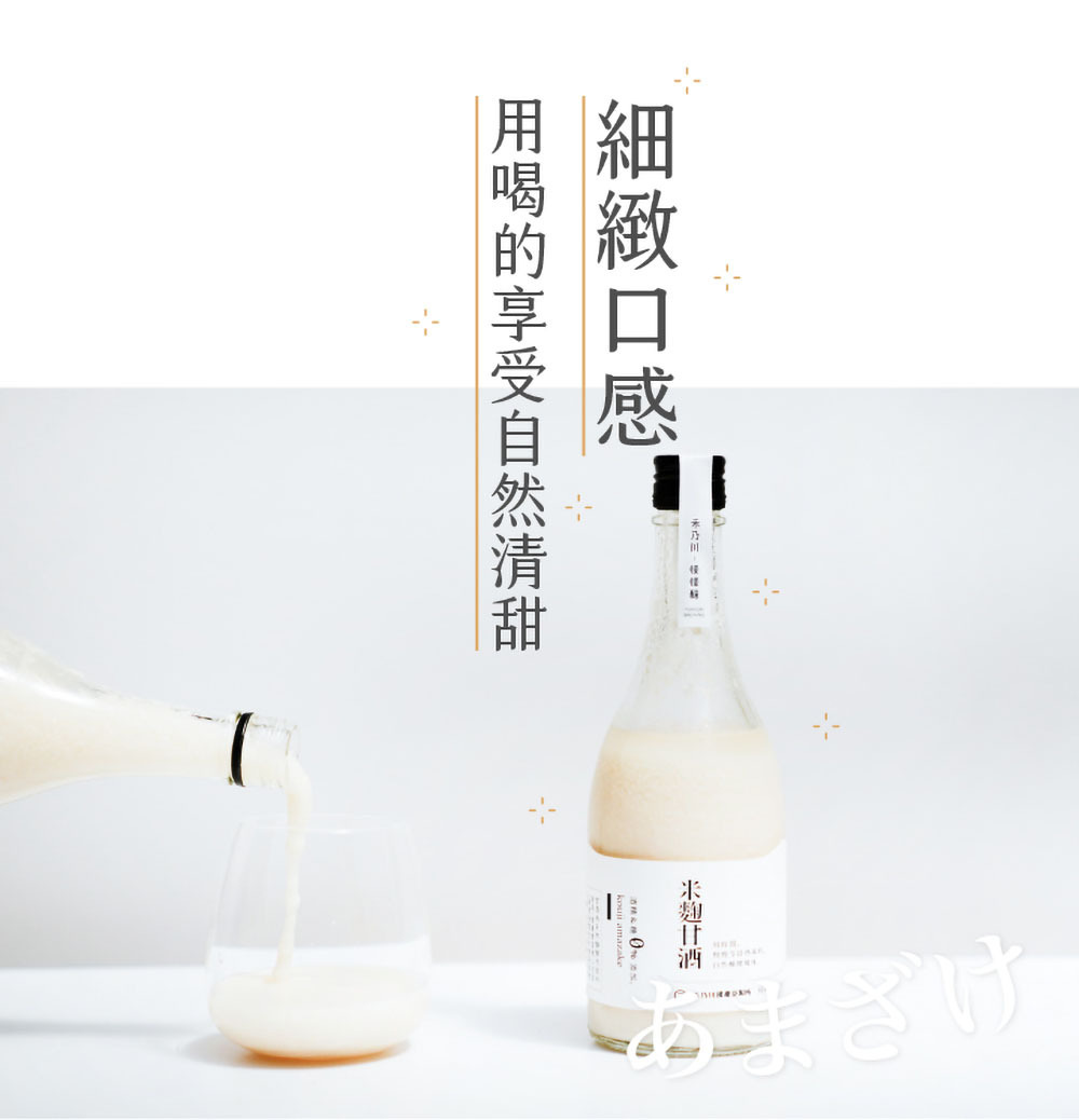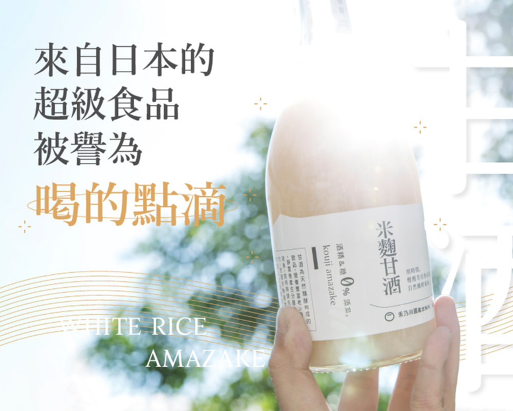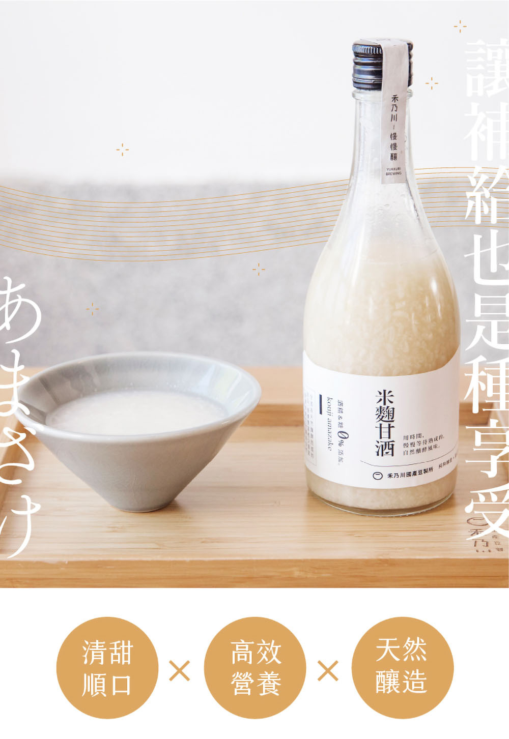 甘酒是日本的傳統飲品,為「無酒精」天然米麴釀酵。營養豐富均勻,成分以維他命B 群、胺基酸、酵素、葡萄糖為主,甜甜的香氣,還可以吃到米粒真實口感。老少咸宜,在日本被譽為喝的點滴