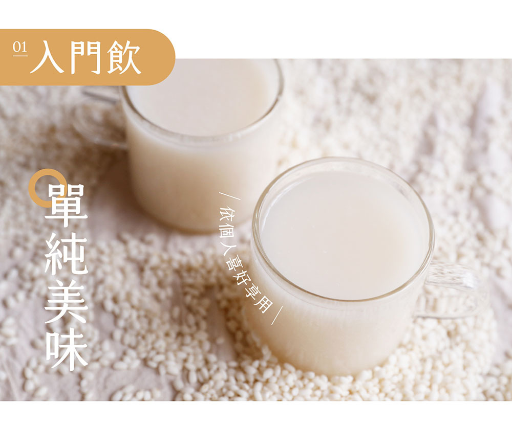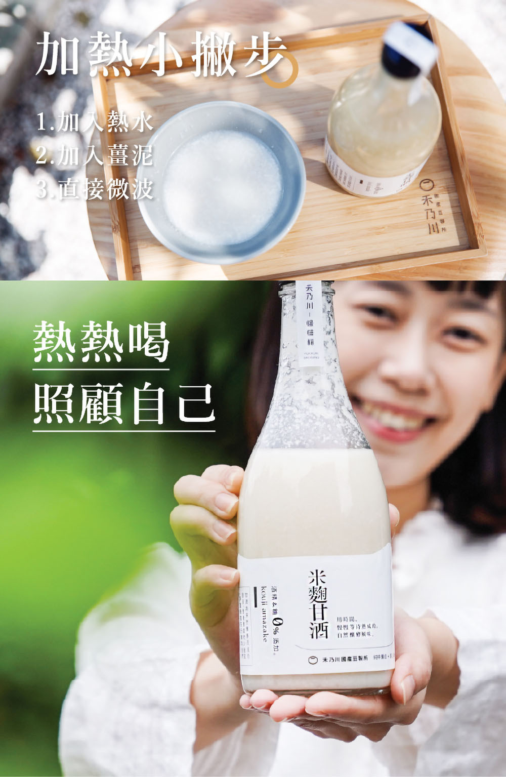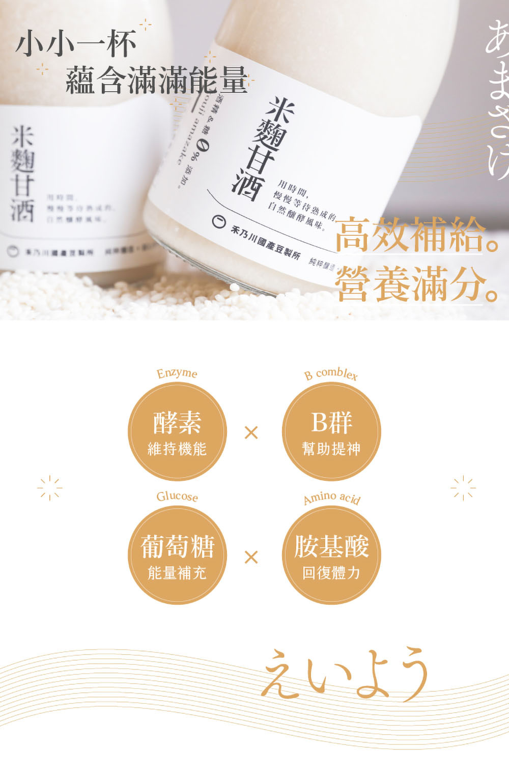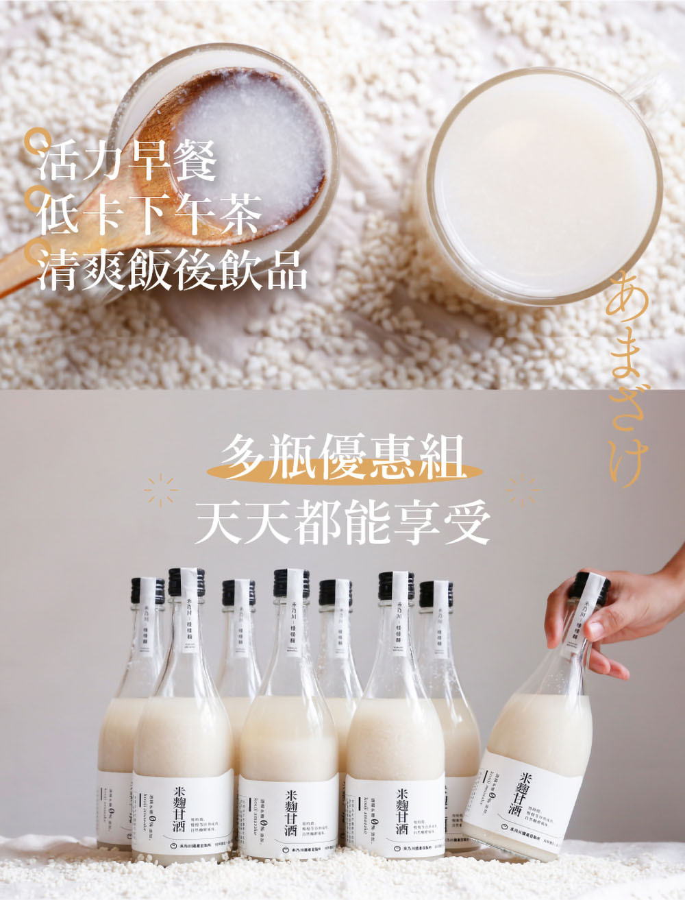 甘酒是日本的傳統飲品,為「無酒精」天然米麴釀酵。營養豐富均勻,成分以維他命B 群、胺基酸、酵素、葡萄糖為主,甜甜的香氣,還可以吃到米粒真實口感。老少咸宜,在日本被譽為喝的點滴