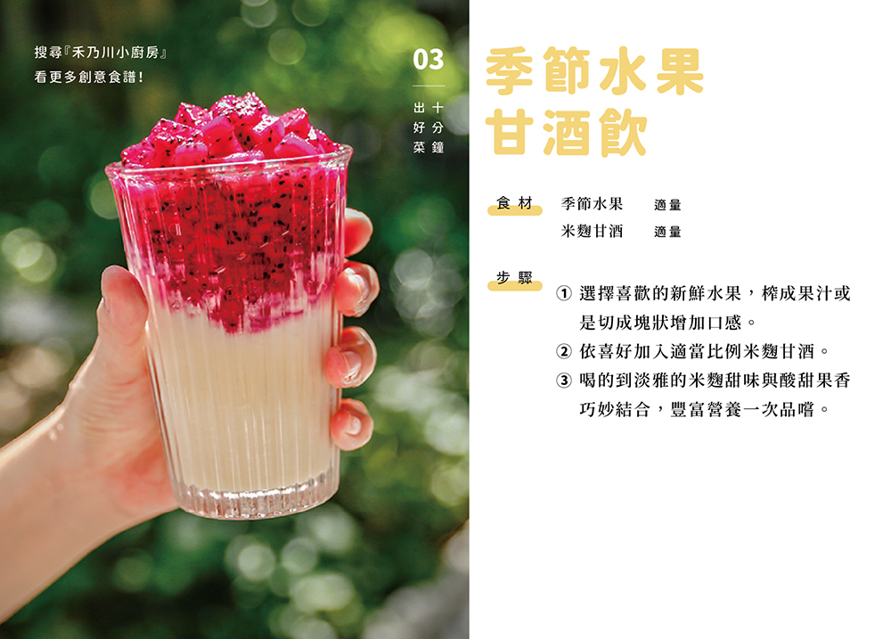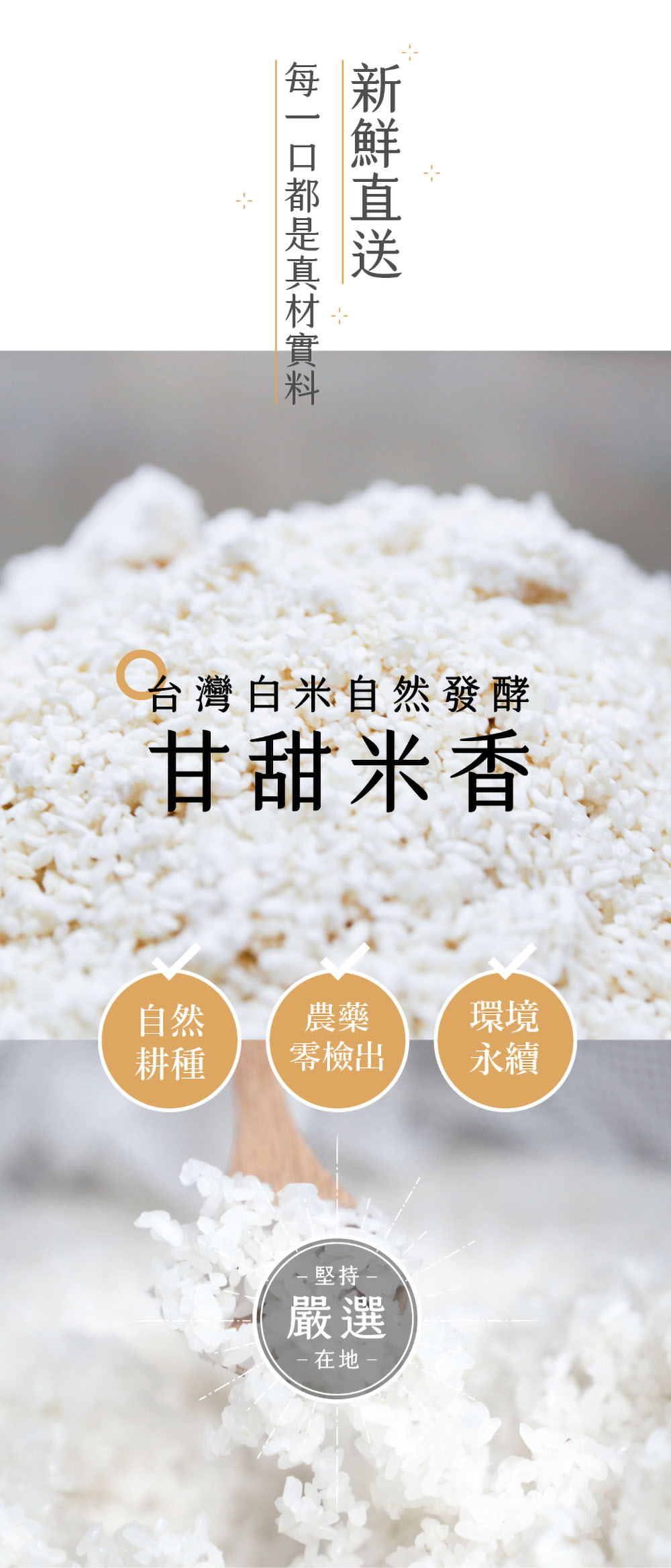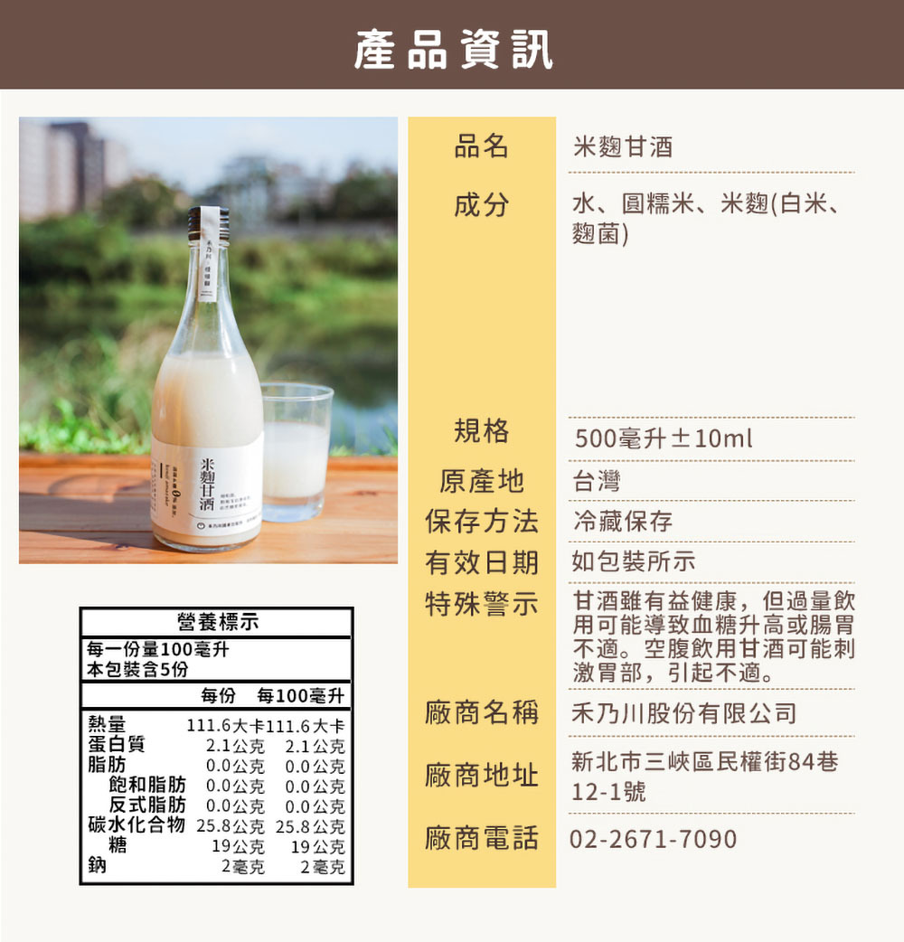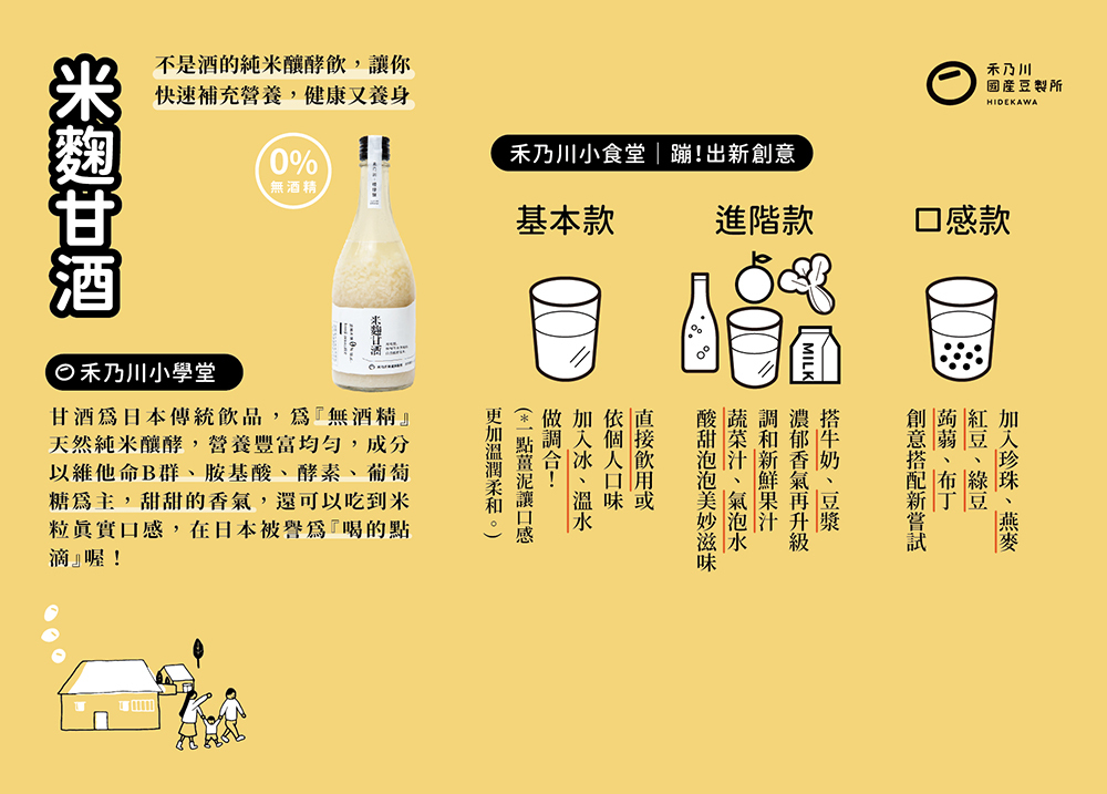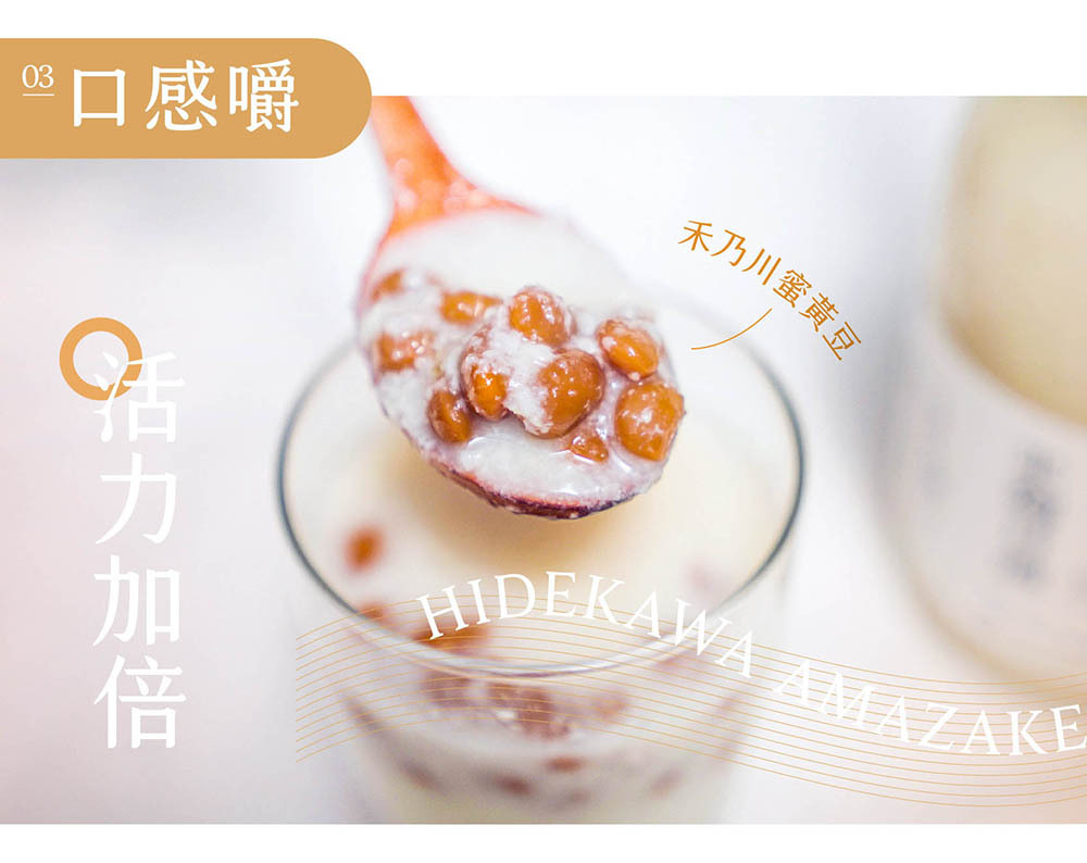 甘酒是日本的傳統飲品,為「無酒精」天然米麴釀酵。營養豐富均勻,成分以維他命B 群、胺基酸、酵素、葡萄糖為主,甜甜的香氣,還可以吃到米粒真實口感。老少咸宜,在日本被譽為喝的點滴