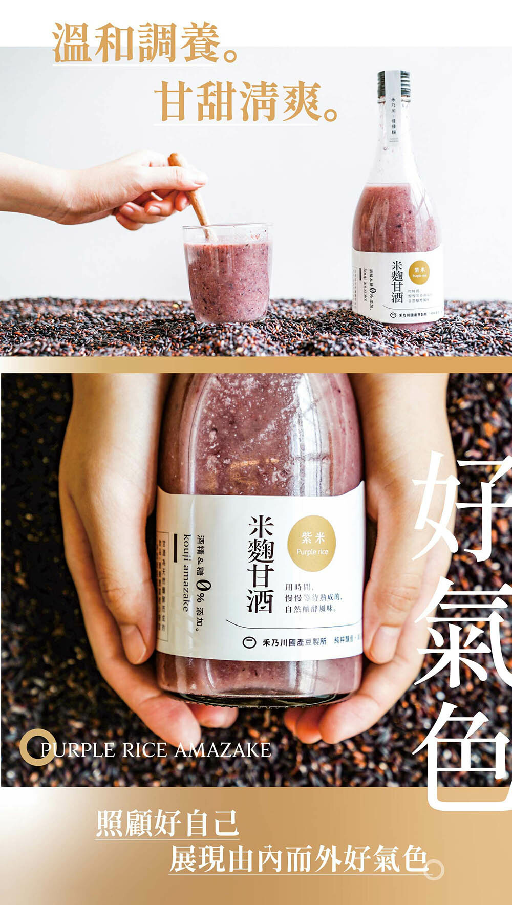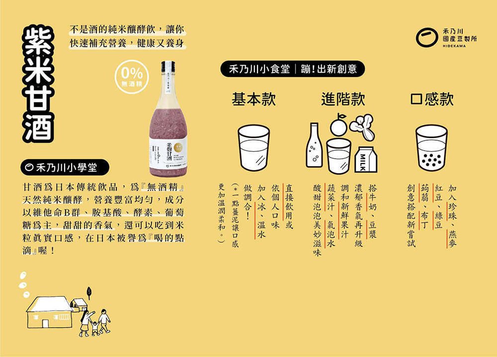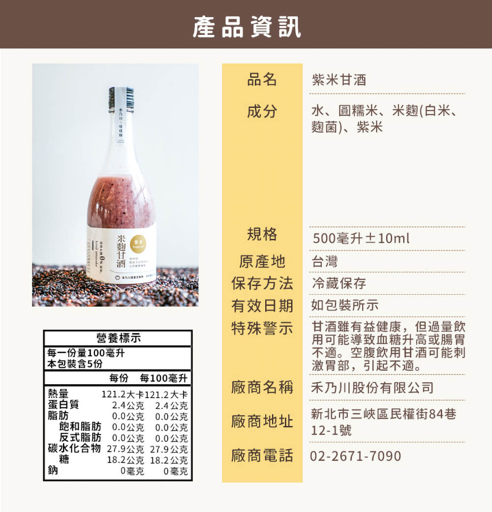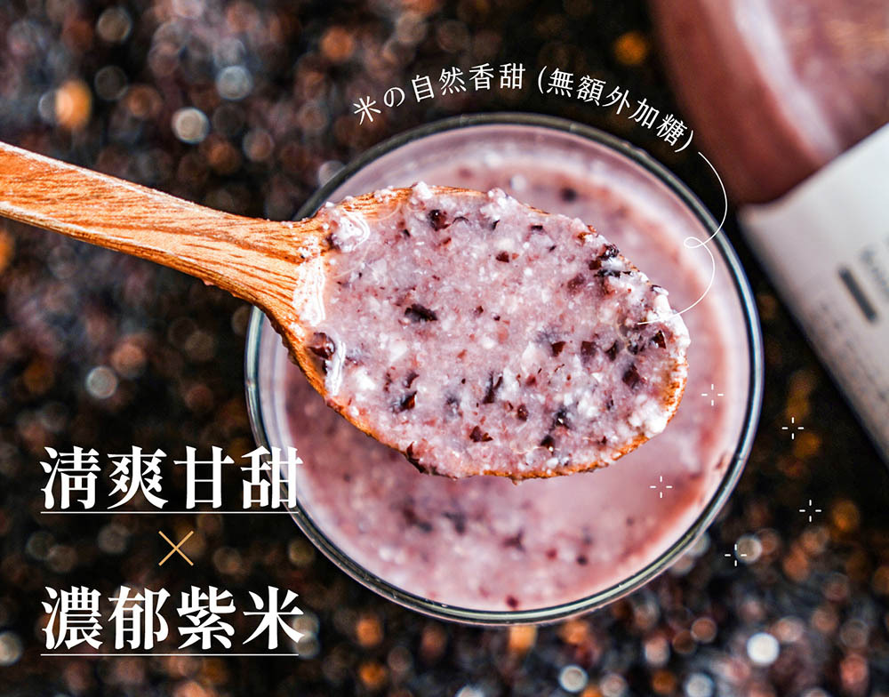 結合了東臺灣最純淨的滋味!嚴選臺東友善農法品牌「源天然」的紫纖糯,以保育生態的自然農法耕作,再搭配臺灣白米發酵而成的天然米麴,精心釀製出的「紫米甘酒」,香甜滑順的口感中能咀嚼到白米與紫纖糯的顆粒,淡雅清甜的香氣在口中快散,並豐含維他命B 群、胺基酸、酵素、葡萄糖、膳食纖維、花青素與礦物質等營養素,能促進腸道蠕動、增加飽足感,給身體無負擔的加倍營養!也能來點特調加入豆漿、牛奶等,冷熱皆宜的多變風味適合全家大小,隨時都能享用的低卡健康補給。