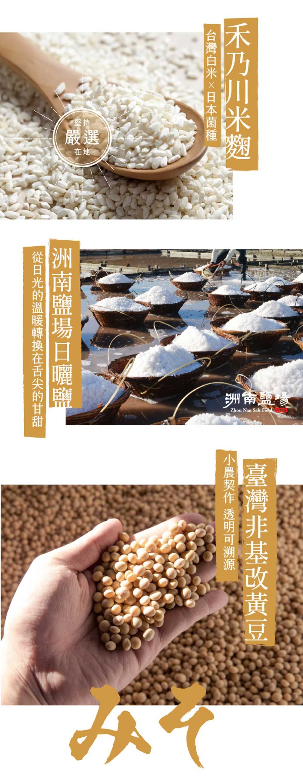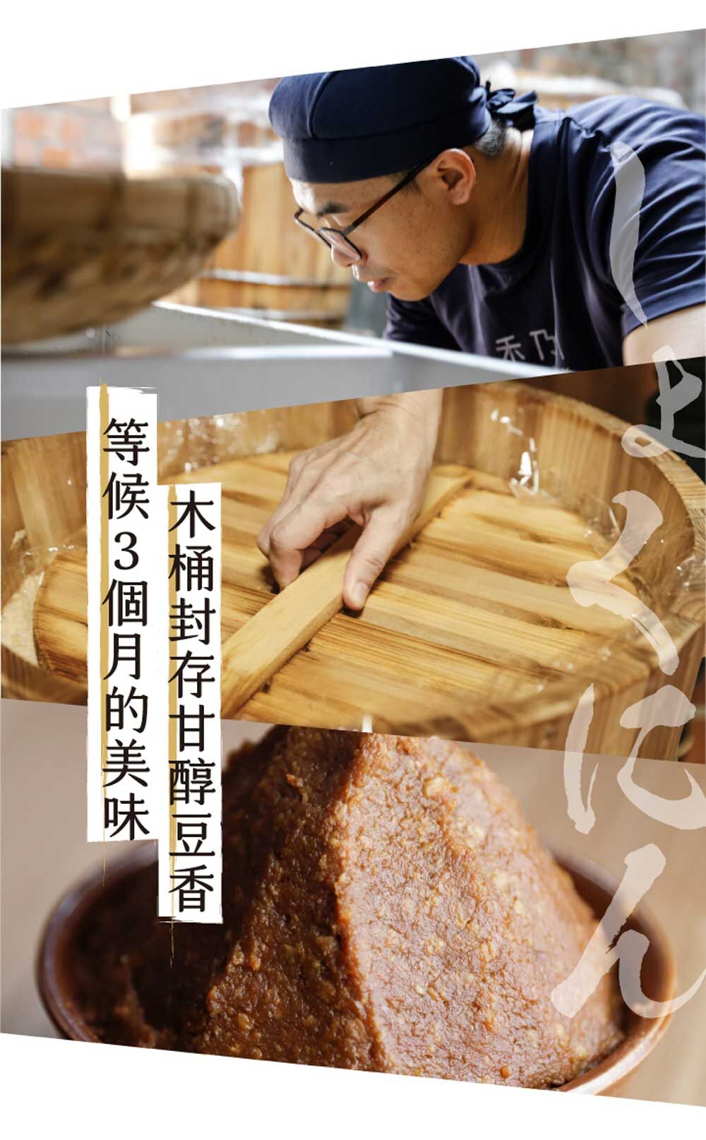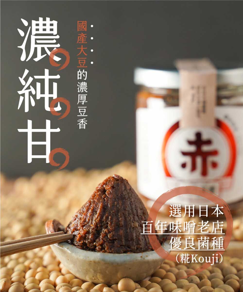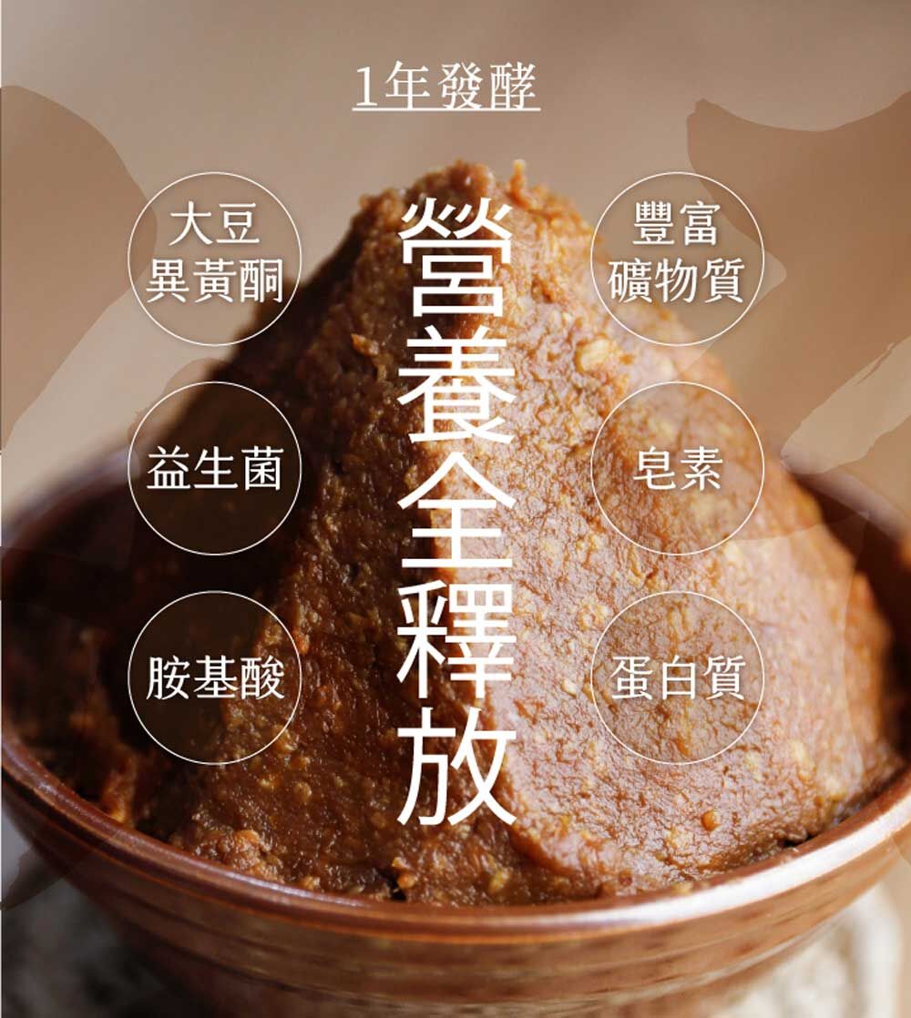 一年熟成的赤味噌,封存在三峽老師傅的手工木桶中,隨著醞釀時間的增長,鹽分含量較高,但其香氣更加濃厚,帶有黃豆的自然風味,夾帶隨著時間散發出的米麴甘甜,堅持天然無添加,為您的餐桌增加一份美味與安心。
