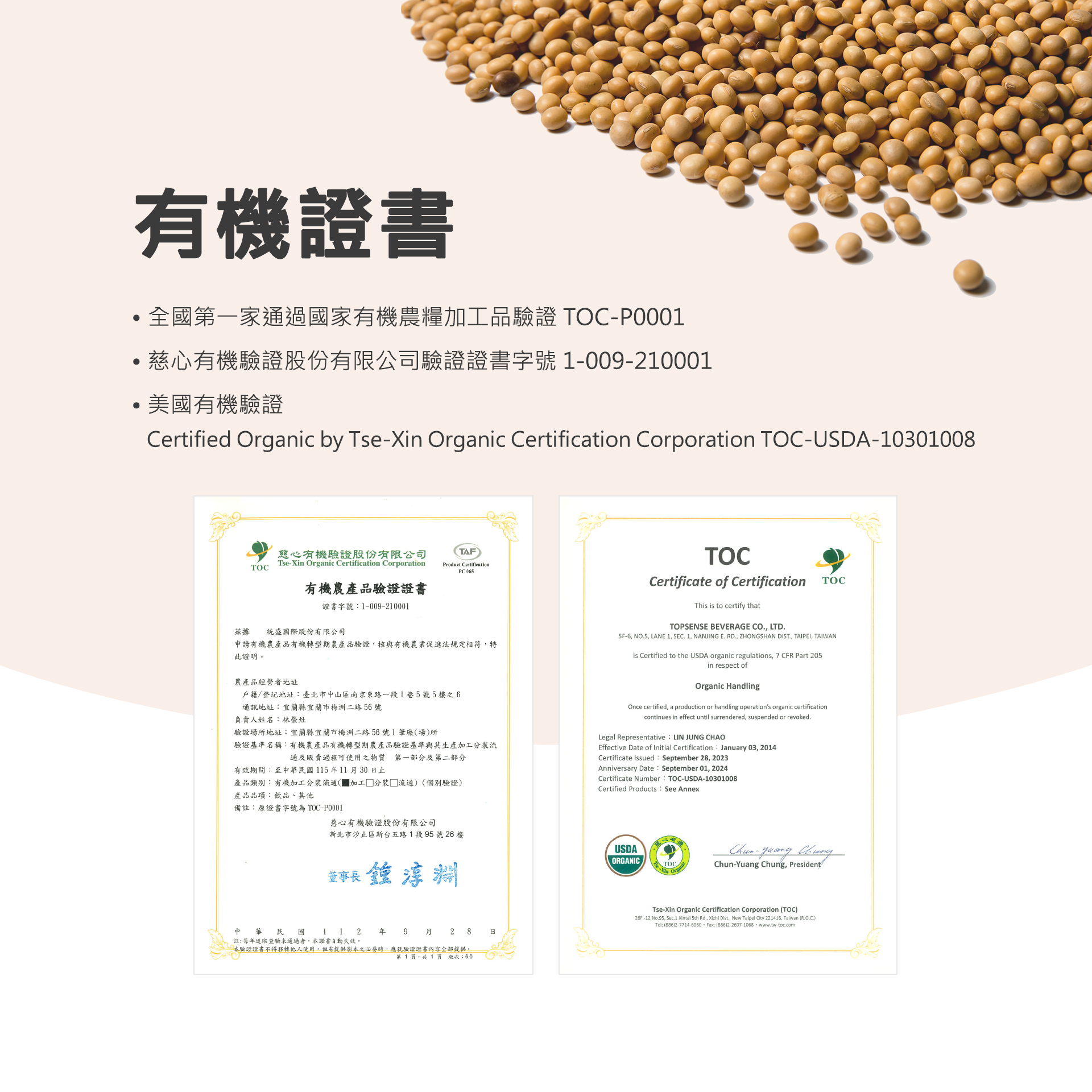 堅持使用上等的黑豆磨煮,搭配純淨的蘭陽水製造,豆香非常濃郁香醇順口,營養豐富,冷藏後風味更佳,亦可加溫飲用。是最自然又健康的養生的飲品。不添加防腐劑,不添加人工香料及色素,含純天然植物性蛋白質及大豆異黃酮,營養豐富、味甜甘美。