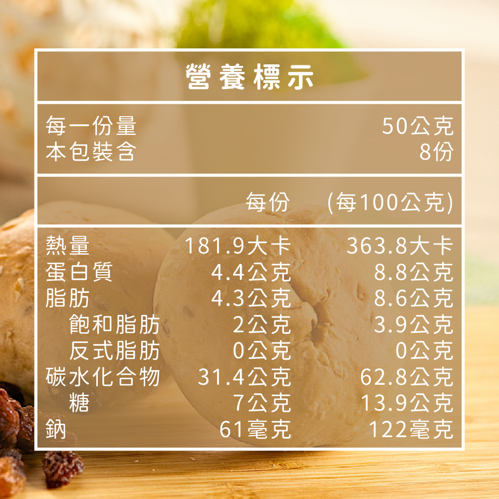 成份:麵粉、紅糖、葡萄乾、NEBOS複合式烘焙油【植物性油脂(軟質棕油、大豆油、硬質棕油),水,奶油,食鹽,分離大豆蛋白,燕麥纖維。燕麥片、核桃、亞麻仁、酵母、鹽、大豆油。